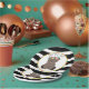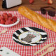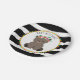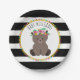Baby shower paper plates featuring an illustration of a baby bear cub wearing a flower crown inside a circle with pompom inspired design. Background is black and white stripes. Personalize the name.