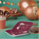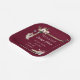 Baby birth details for either gender on a burgundy red background. Decor includes fun feathers, flowers, crystal rock, and hand-lashed arbor for an event that makes a memory.