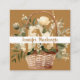 The beige flowers and basket tie directly into dried florals, pampas grass, and neutral colour palettes popular in boho weddings.