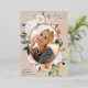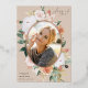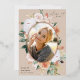 Élégant faire-part floral de graduation photo comprend une photo verticale encadrée par une couronne ovale de fleurs d'aquarelle et de feuillage dans des tons boho désert inspirés de pêche, blanc, ivoire, et vert sauge et agrémenté de feuille d'or rose. Personnalisez avec le nom de votre diplômé, l'année de classe et l'école. Ajoutez un message personnel à l'arrière, ainsi qu'une photo supplémentaire.