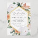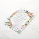 Elegant floral baby dedication invitation features an elongated hexagonal frame of watercolor flowers and foliage in boho desert inspired shades of peach, white, ivory, and sage green, and finished with gold foil trim. Personalize with your church dedication ceremony and party details in modern lettering.