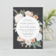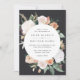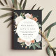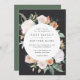 Elegant floral wedding invitation features your wedding details in modern lettering, set in a round frame of pastel watercolor flowers and botanical foliage in desert inspired earth tone shades of peach, sage green, white and ivory.