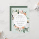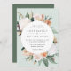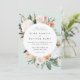 Elegant floral wedding invitation features your wedding details in modern lettering, set in a round frame of pastel watercolor flowers and botanical foliage in desert inspired earth tone shades of peach, sage green, white and ivory.