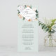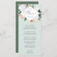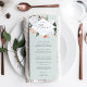 Boho chic floral wedding menus feature a geometric element at the top with your initials and wedding date, framed by a watercolor border of sage green botanical foliage and pastel earth tone flowers in desert inspired shades of peach, ivory, and white. Personalize with your menu items beneath in modern lettering. Designed to coordinate with our Boho Blooms wedding and event collection.