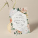 Elegant floral wedding invitation features your wedding details in modern lettering, set in a geometric diamond shaped frame of pastel watercolor flowers and botanical foliage in desert inspired earth tone shades of peach, sage green, white and ivory.