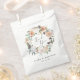 Boho chic event or wedding favour bags say thank you to guests in elegant style. Bags feature a watercolor wreath of sage green botanical foliage and pastel earth tone flowers in shades of peach, ivory, and white, framing "thank you" in calligraphy script lettering. Personalize with your names or event name and date beneath in modern lettering. Designed to coordinate with our Boho Blooms wedding and event collection.