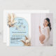 A gorgeous baby shower invitation with a desert theme. The front of this card is embellished with a watercolor bouquet that was painted by hand and features dried palm leaves, eucalyptus greenery, white orchids, blue florals, and pampas grass. The event details are printed to the right, below, in a combination of beautiful script hand-lettering and traditional serif typography. In the same dreamy blue as the flowers is written the mother's name. In reverse, the cards feature a white diamond design on a blue background. Perfect for the summer, autumn, winter, and spring seasons
