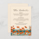 This beautiful boho bohemian QR code the details wedding, features an ink drawing of poppies wildflowers with rustic warm colours, orange and teal, inspired in traditional Japanese art technique ukiyo-e or Japanese wood block prints.