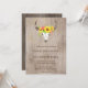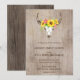 Boho Bull faire-part de mariage crâne avec tournesol sur un arrière - plan en bois. Les fleurs s'assoient sur le dessus de la tête du crâne. L'arrière de l'invitation a un arrière - plan en bois marron foncé.