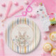 Celebrate a new arrival with these whimsical storybook-inspired paper plates. This design features a hand-painted watercolor bunny centered among soft meadow wildflowers and a muted vertical stripe border. Perfect for a gender-neutral woodland baby shower or a sweet spring birthday celebration.