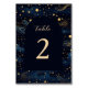 Guide your guests to their seats under a starlit sky with this boho celestial wedding table number. Featuring a luxurious navy night sky, shimmering gold stars, and elegant modern script, this double-sided card brings a dreamy, romantic touch to your wedding reception. Perfect for celestial, boho, and starry night themed weddings.