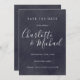 Doté de noms de style signature, ce tableau noir élégant enregistrer la carte de date peut être personnalisé avec vos informations spéciales de jour de mariage en lettrage blanc chic. Conçu par Thisisnotme©