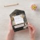 AVAILABLE WITH OR WITHOUT A QR CODE OR WITH OR WITHOUT DINNER SELECTION OPTIONS. Modern and unique, this design features bouquet of dried grasses, flowers, and plants in boho style on a soft black background that has been distressed with champagne gold. Add a QR code to your invitation so that gusts can quickly access your wedding Website for details, directions, menu options, and more, or add your gift registry Web URL. Personalized All-In-One invitations are a unique combination of both a beautifully printed custom invitation with an easy to tear off perforated RSVP postcard. And they are so easy to use! You simply fold, then seal the back flap with the three included clear stickers, and mail. And when your guests receive your custom invite, they just tear the perforated RSVP Card off and drop it back in the mail to you!