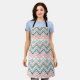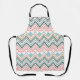 This apron has a boho design of lines, dots, and diamond shapes in retro blue, aqua, pink, and orange.