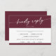 Cette carte rsvp chic et boho rouge au choix au menu est parfaite pour un mariage minimaliste. Le vin de marron foncé rouge design bohème moderne dispose de calligraphie rustique simple avec un style unique mais classique. Inclure les options de repas pour votre réception sur la carte de l'enceinte.