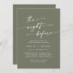 This boho chic olive green rehearsal dinner invitation is perfect for a minimalist night before wedding rehearsal. The woodsy dark green earth tone modern bohemian design features simple rustic calligraphy with a unique yet classic style.