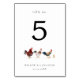 Numéro de table de mariage rustique et boho avec illustration de l'aquarelle des poulets.