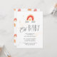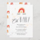 Boho baby shower invitation featuring rainbow with clouds illustrations in red and orange paired with a personalized script font. Check out our store for more matching items from this collection.