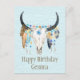 Modern and slightly funky watercolor illustration of Boho feathers and beads decorated cow / steer skull with customizable "Happy Birthday" text on a light blue textured background.