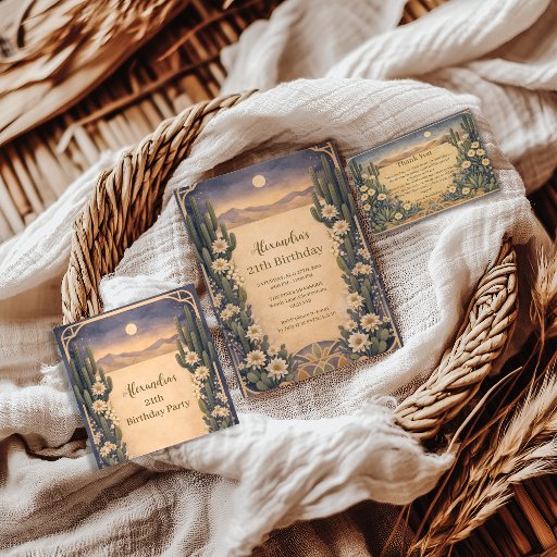 A warm desert-inspired birthday design featuring soft canyon landscapes, cactus botanicals, and earthy neutral tones. The vintage botanical frame and natural color palette create a timeless southwestern look, perfect for milestone birthdays or elegant outdoor celebrations. Ideal for anyone who loves desert scenery, rustic details, and refined botanical styling.