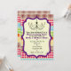 A housewarming party invitation with a background on front and back of polka dots in various sizes and a bohemian inspired colour scheme. Chadelier with matching colours hangs from top. Personalize the purple and black text inside purple frame with details of your occasion.