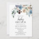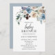 Le baby shower Boho présente des fleurs bleues poussiéreuses et beiges neutres avec des feuilles séchés.