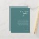 Cette carte de remerciements de réception Dusty Boho Green & Blue est parfaite pour votre mariage boho rustique et coloré. Son design moderne simple et unique, accompagné d'un script minimaliste contemporain, d'un bleu poussiéreux et d'une palette de couleurs turquoises et vertes, donne à ce produit une atmosphère bohème chic classique. Gardez-le tel quel, ou choisissez de le personnaliser avec des illustrations ou des graphiques de votre choix. Vous pouvez également chercher d'autres produits dans cette collection pour réunir votre mariage entier !