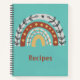 Modern and artistic design features hand drawn Boho rainbow doodle in earth tones on aqua background. Customizable "Recipes" text in modern terra cotta coloured font