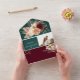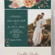 Elegant emerald green boho all-in-one wedding invitation with burgundy, peach, and ivory watercolor florals. Includes RSVP section with a scannable QR code, perfect for modern couples. Features your custom photo and personalized wedding details. Easy to edit. For help, email: bpkolman@gmail.com