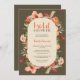 Boho fall terracotta floral script bridal shower invitation featuring pretty hand painted warm hues of terracotta, peach and dark greenery with a round mask on dark green background. Perfect for fall boho themed bridal shower party. With a modern script typography.