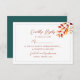 Elegant and seasonal, this teal and orange fall wedding RSVP card features watercolor autumn foliage and a simple, classic layout for collecting guest responses. With space for meal preferences and a return by date, it's perfect for coordinating with your autumn-themed wedding suite. Fully customizable to match your event details and personal style.
