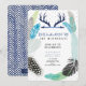 Boho tribal Birthday invite adorned with blue, grey and neutral feathers, arrows, deer antlers. Have a pow wow birthday party with this Bohemian tribal invite