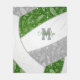 This boho volleyball themed fleece blanket for her features the realistic image of an abstractly oversized volleyball that has green, grey and white panels - a continuous doodle pattern of paislies, flowers and feathers in white covers the volleyball's green and grey panels - personalize with the athlete's name and monogram, varsity letter or jersey number - by katz_d_zynes