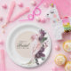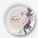 Beautifully unique party supplies for a bridal shower, this boho inspired paper plate design has a pink parrot perched atop lush tropical watercolor florals Celebrate the bride-to-be in memorable style! The beautiful flowers in this elegant design include exotic proteas, orchids, mums and tropical leaves. Personalize the text template with the bride's name.