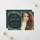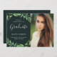 Faire-part photo de graduation tendance avec script de calligraphie élégant et aquarelle feuillage botanique. Personnalisez le design avec votre photo personnalisée, nom, date de graduation. Ajoutez les détails de l'invitation de la partie ou des photos supplémentaires au dos. Idéal pour une fête de fin d'études au collège, au collège, au lycée ou au collège. Cliquez sur Customiser pour choisir n'importe quelle couleur arrière - plan, modifier les polices de texte et les couleurs et créer votre propre design unique d'un genre unique!