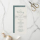 Élégant, boho, fleur sauvage, botanique, programme de mariage vert sauge avec coeur de corde argent et dentelle vintage dorée fleurie.