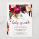 This trendy baby sprinkle invitation features pretty watercolor flowers in vibrant shades of marsala, wine, deep green, red, and purple, and matching modern typography.