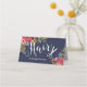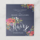 Folded appointment card for a hair stylist in dark blue featuring beautiful hand-drawn flowers in orange, pink, red, and white, with Hair written in a white calligraphy next to a pair of scissors.