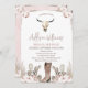 Sweet western or rodeo themed bridal shower invitation featuring a bull or cow skull, cowgirl boot, some floral arrangements with pampas grass and cactus.