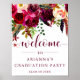 This trendy graduation party welcome sign features pretty watercolor flowers in vibrant shades of marsala, wine, deep green, red, and purple, and matching modern typography.