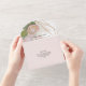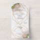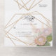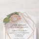 "Boho Floral Pampas Grass Protea Geometric Gold All in One Invitation." Elegant hand painted boho style floral design with protea blossoms, peony, white hydrangeas, leaf foliage and pampas grass greenery over a rose gold glitter geometric frame for a modern touch. Art by internationally licensed artist and designer, Audrey Jeanne Roberts, copyright.