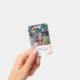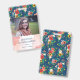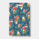 Charming vertical badge for an interior designer, event stylist, makeup artist or similar, featuring a pattern of hand-drawn flowers in vibrant colours against a blue background and a blush pink watercolor texture. Personalize with your name, title, and photo.