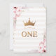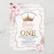 Sweet princess crown 1st birthday invitation in pink and gold featuring a large faux gold glitter word, and crown as well as two pink watercolor floral arrangements with some pampas grass. This design also features a decorative frame and faux gold glitter dots.