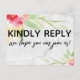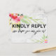 Both sides of this card were embellished with pretty watercolor flowers. In editable text "kindly reply" was placed, large and bold, on the front. In a modern casual handwriting, a graphic depicting "we hope you can join us!" appears below. On the back, the same unique font was used to create graphics that read "rsvp", "m", "kindly deliver to:" and "i promise to dance if you play:" All other text is editable. Use the template fields to personalize as much as you wish. The background is covered in a subtle marble graphic. // 100 //