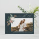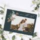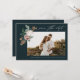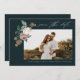 A romantic wedding save the date announcement featuring beautiful vintage botanicals atop a dark textural background with landscape photo.