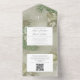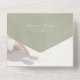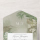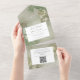 This design features a boho modern simple destination an elegant seal and sends with a modern QR code website online, scannable URL scan guest information, an elegant seal and send, trifold tri fold budget wedding, green tropical leaves leaf, botanical beach ocean coastal, with watercolor sage lime greenery foliage, elegant simple minimalist minimal, a rustic classic calligraphy script font and photo placement for engagement couple picture