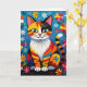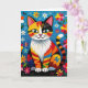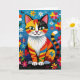 A cute cat pun filled birthday card. A cute colorful boho cat sitting in flowers and surrounded by butterflies. The art is in an impasto oil paper quilling style.