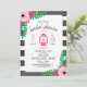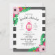 A wedding bridal shower invitation featuring an illustration of camping lantern at centre with floral designs at top left and bottom right corners. Design has a pink and black colour scheme. Personalize the text. Background is black and white stripes.