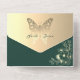 Chic, elegant, modern, boho, gold and emerald green, formal all-in-one wedding invitation with unique and sophisticated faux gold butterfly, symbol of spiritual rebirth, hope, and life.