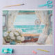 Escape to the sea with this romantic decoupage tissue paper featuring a peaceful view from a boho gypsy seaside caravan. Lace curtains frame a sunlit ocean scene with soft pillows, white hydrangeas, and a gentle dreamcatcher swaying in the breeze. Perfect for drawer liners, upcycled furniture, or beach-themed decor, this design brings a calming touch of coastal romance to any DIY or crafting project.